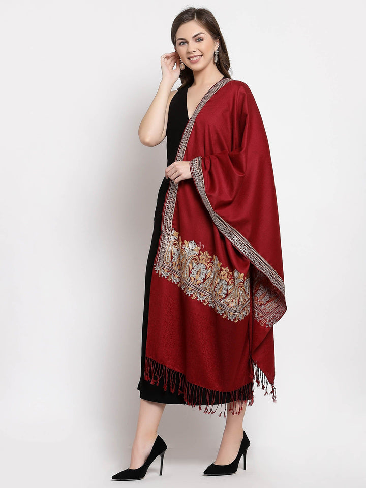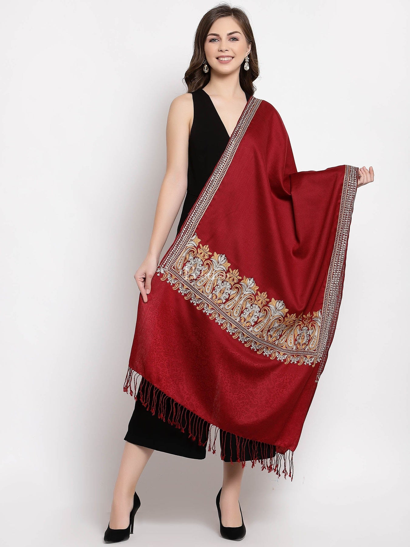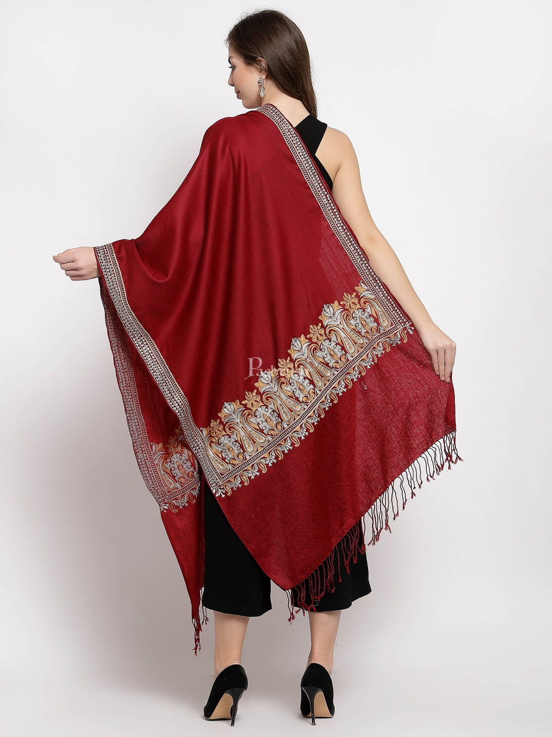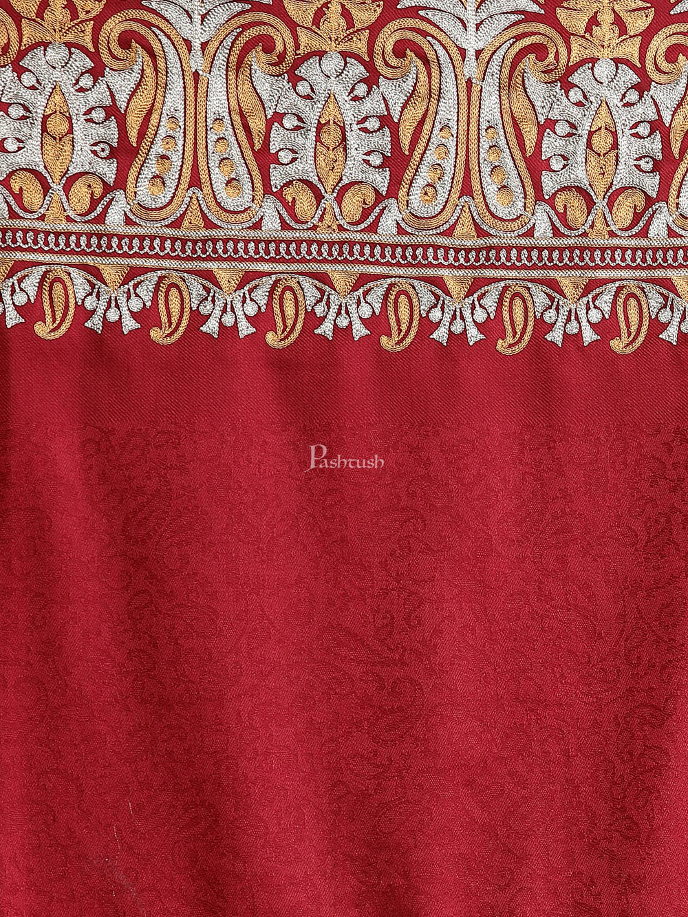 Pashtush Womens Tilla Work Embroidery Stole, Extra Fine Needlework, Crimson