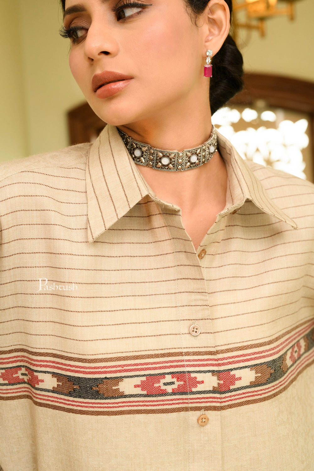This luxurious oversized wool shirt from Pashtush is crafted from fine merino fabric, making it extremely soft and moisture-wicking. This classic woollen Shirt is the perfect blend of style and sophistication. Crafted from fine merino wool, it features a unique ethnic kullu weave pattern and offers an anti-fit ideal for layering. It pairs perfectly with jeans, crop tops, or even a dress coat for a more formal look. Dry cleaning is recommended to maintain its luxurious feel.