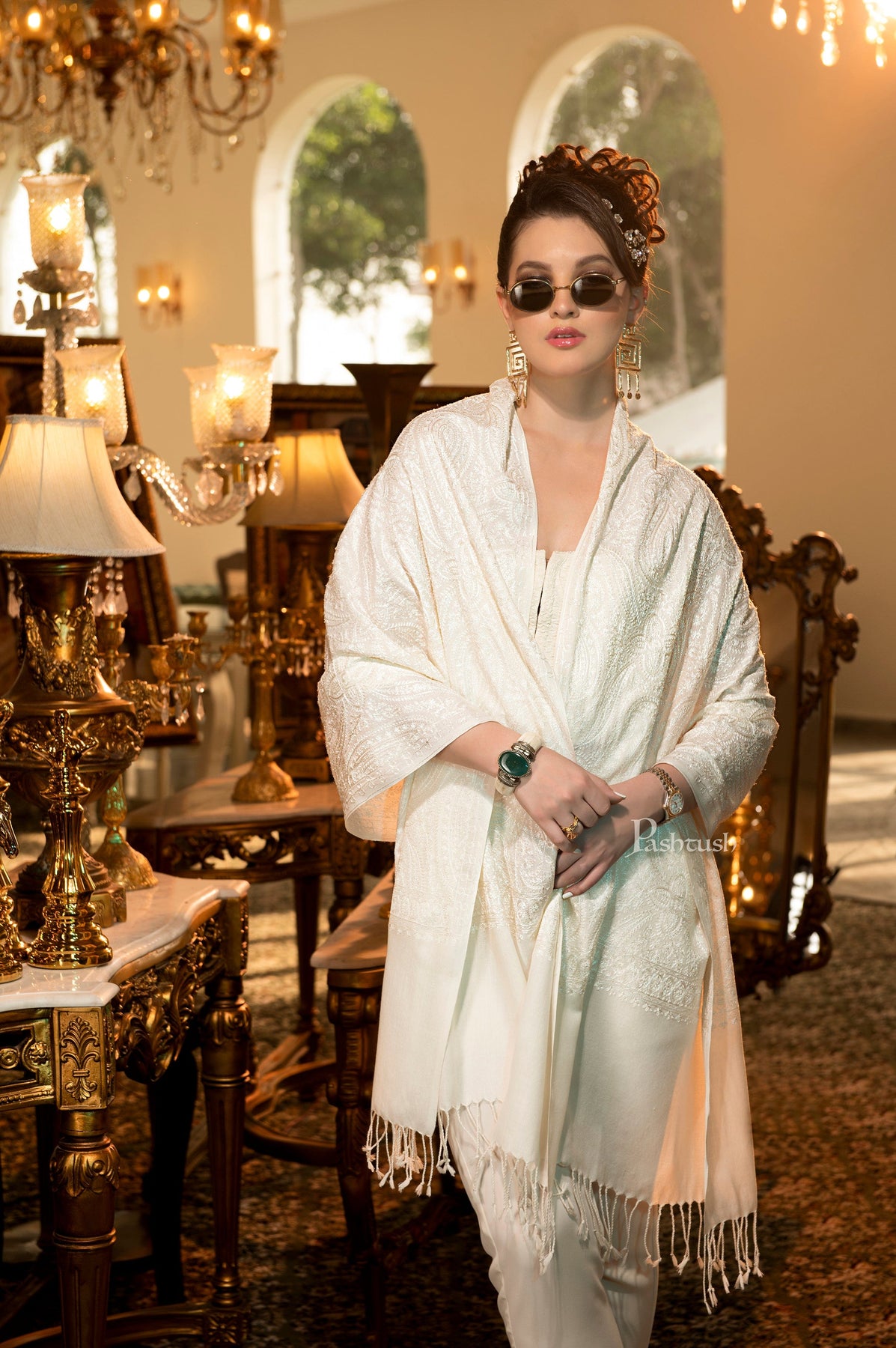 Pashtush Womens Stole Fine Woollen, Silky Nalki Embroidery Tone on Tone, Ivory