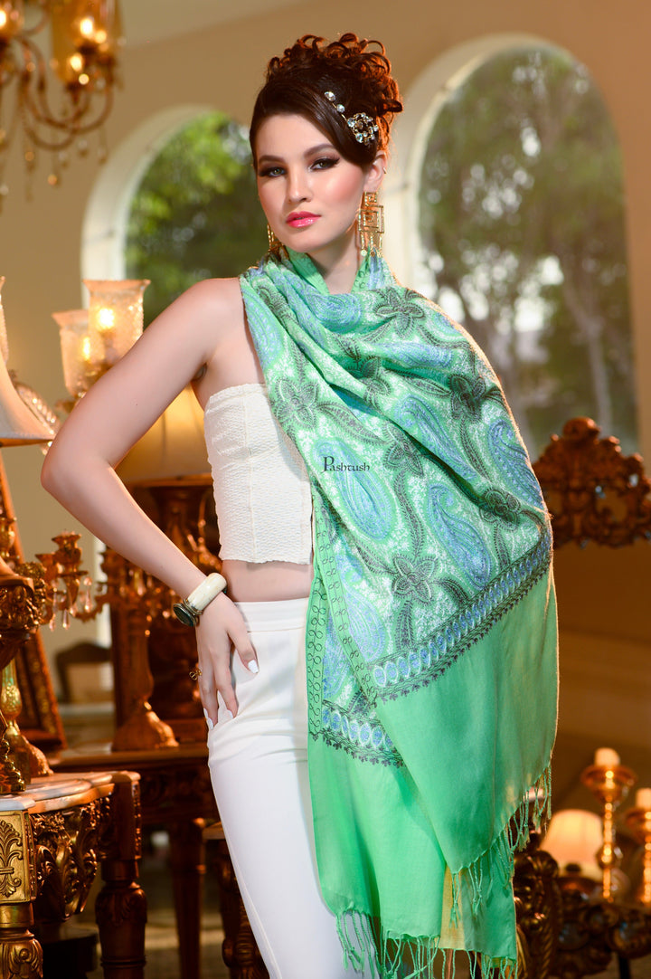 Pashtush Womens Stole, Soft Silky Nalki Embroidery Needlework Stole, Mint