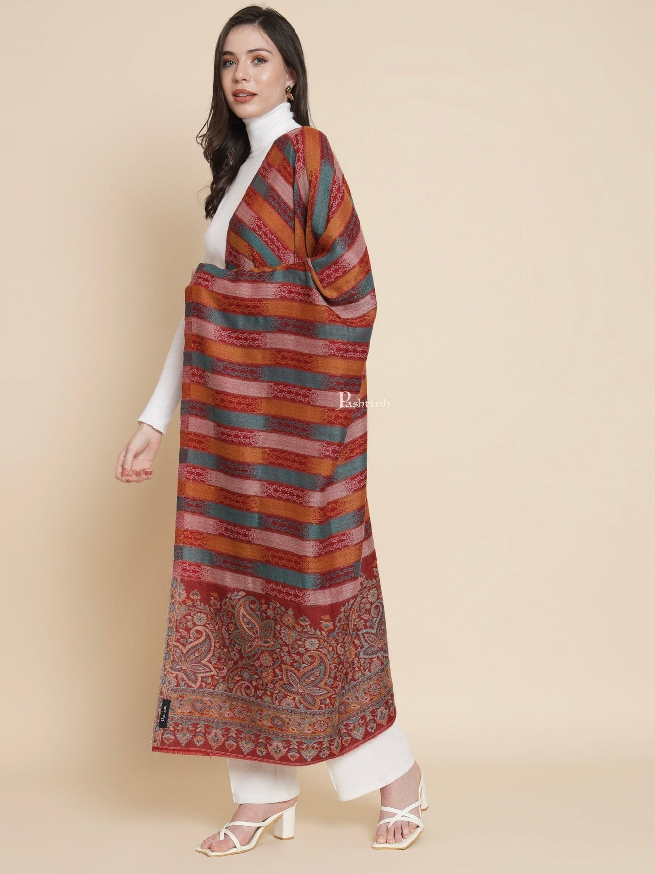 Pashtush Womens Womens, Extra Fine Wool, Striped Paisley Palla Woven, Maroon