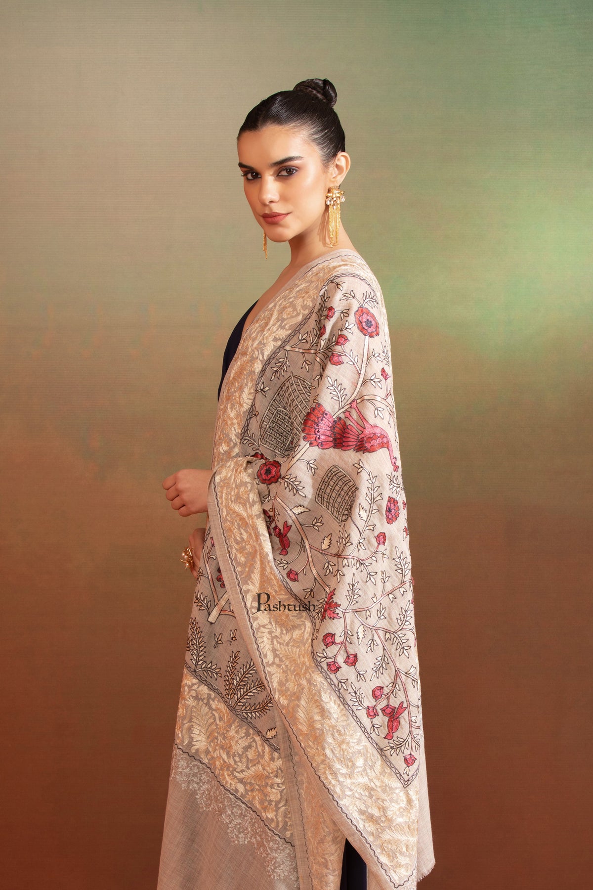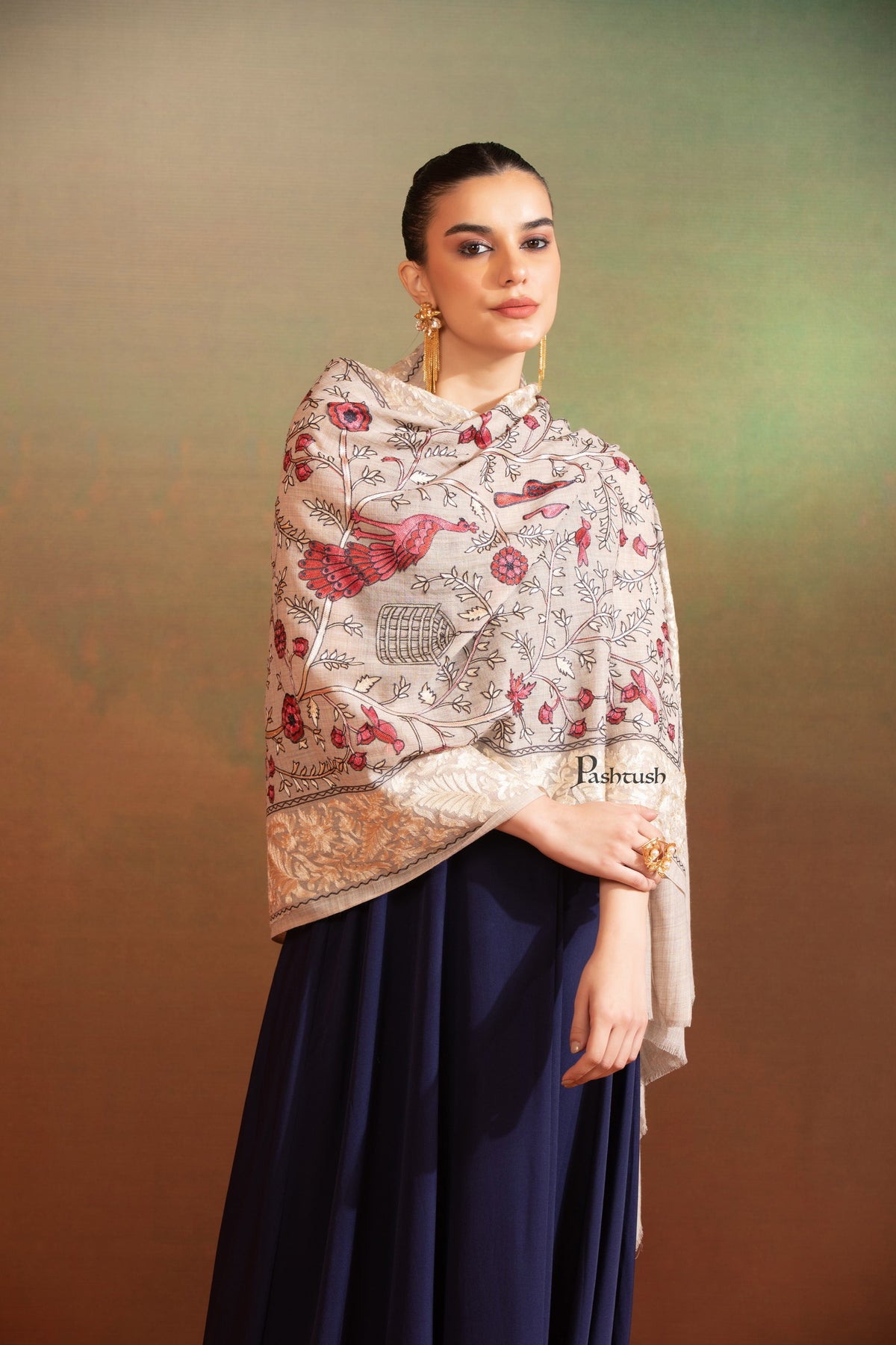 Pashtush Womens Woollen Stole, Gardens Of Paradise, Embroidery Design, Slate