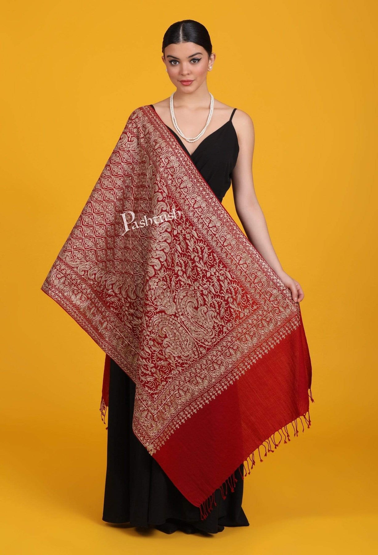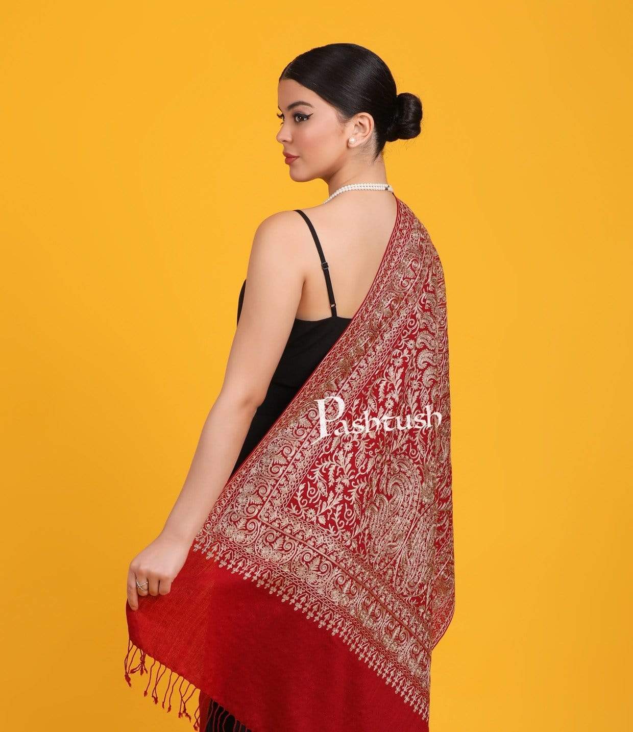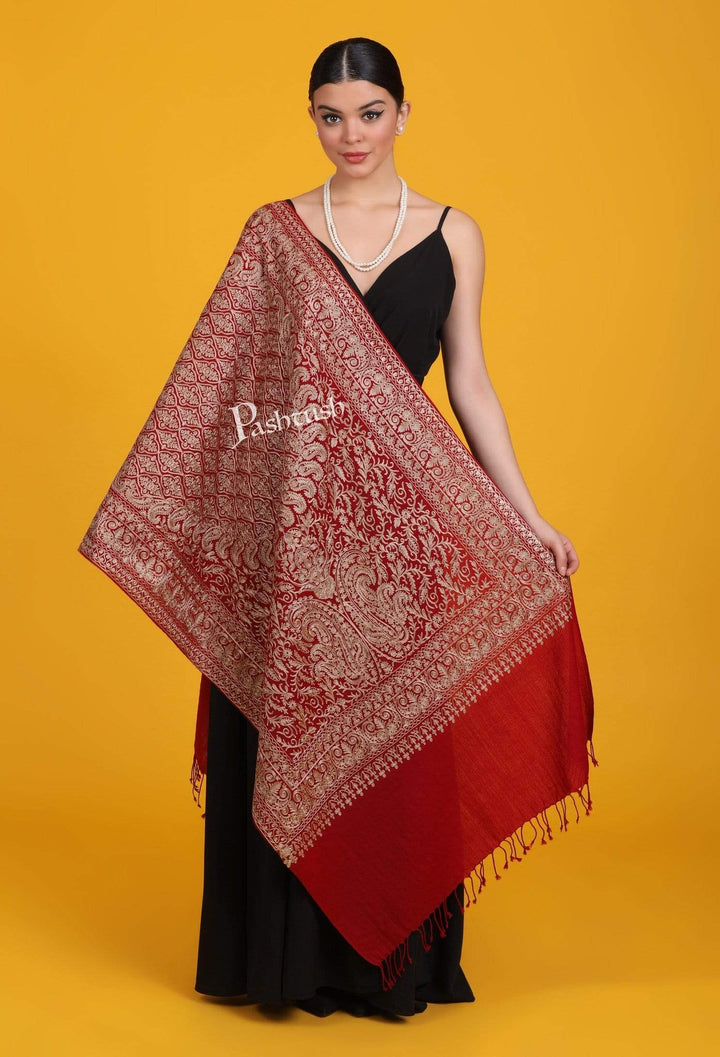Pashtush Womens Woollen Stole, Silky Nalki Embroidery Needlework Stole, Maroon